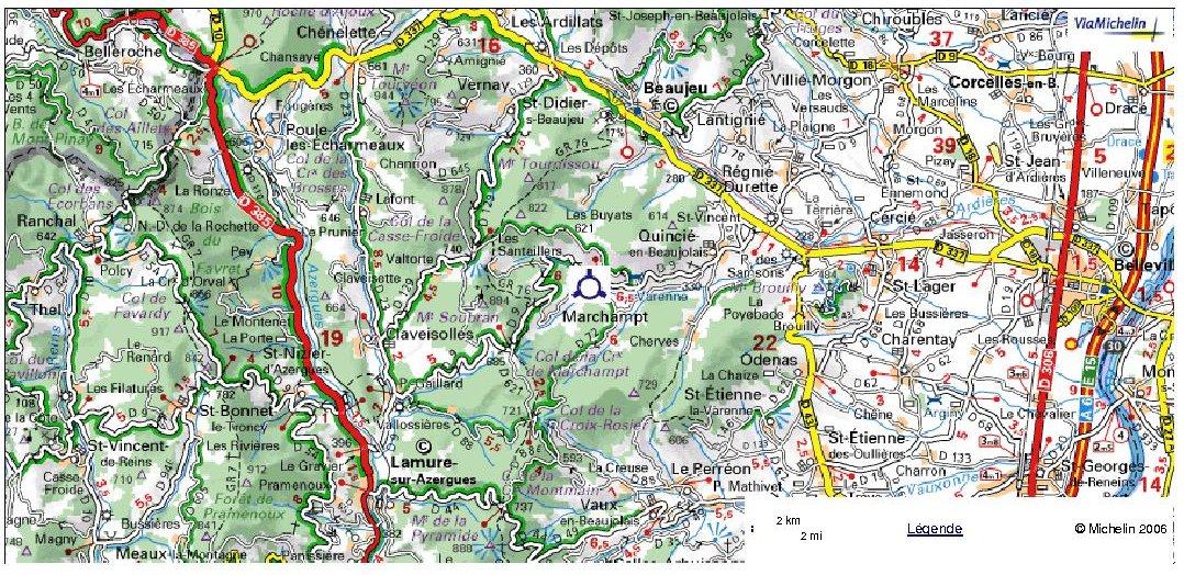 Suivre la D37 en direction de Beaujeu. Après 8 km, peu avant le village de Regnié-Durette, dans le hameau Saint-Vincent, prendre la D9 en direction de Marchampt. A Marchampt, suivre la D72 en direction du col de la Croix-Rosier. A 800 m, première à gauche, à 300 m première à droite, puis après 500 m, encore première à droite : vous montez en longeant la maison. A 20 m sur votre gauche, une cour est réservée pour votre véhicule. Bienvenue !
